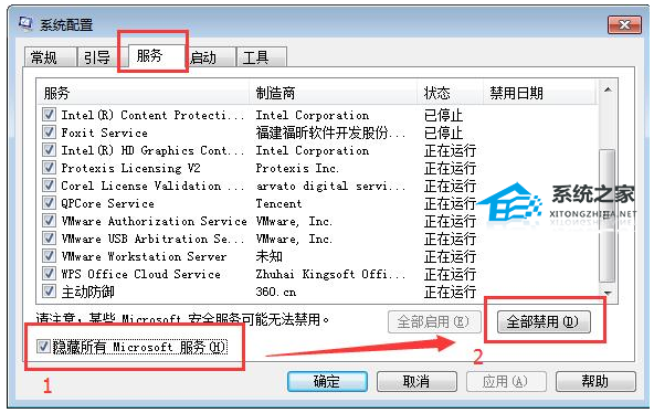 2、然后再系统配置界面,选择【服务】选项卡,勾选【隐藏所有Microsoft服务】,然后单击【全部禁用】按钮。