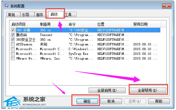 3、然后选择【启动】选项卡,勾选需要禁用开机的软件后单击【全部禁用】,最后单击【确定】。这样就可以解决应用程序错误的问题了。
