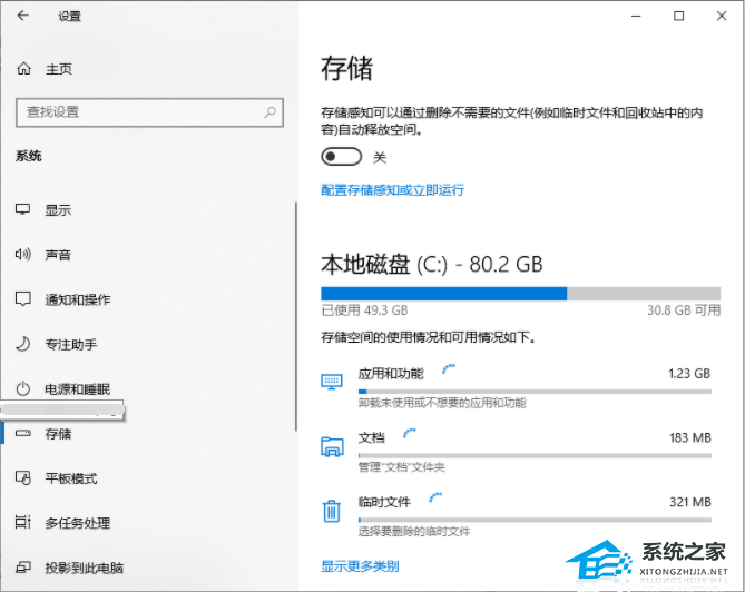 2. 点击左上角的系统选项进入到系统设置,在选项里我们就会发现有个存储的选项。里边显示了电脑各个磁盘目前的空间利用情况。