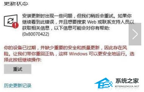 3. 此时我们就可以在更新中看见出现的错误提示了!无论是关机重启还是重试都无法进行更新。