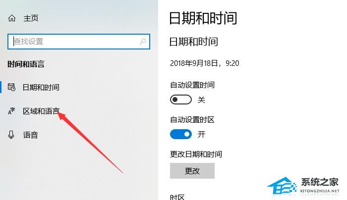 4. 点击左侧任务栏的“区域和语言”。