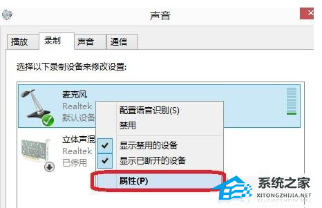 5、在麦克风设备中,右击麦克风,选择属性。