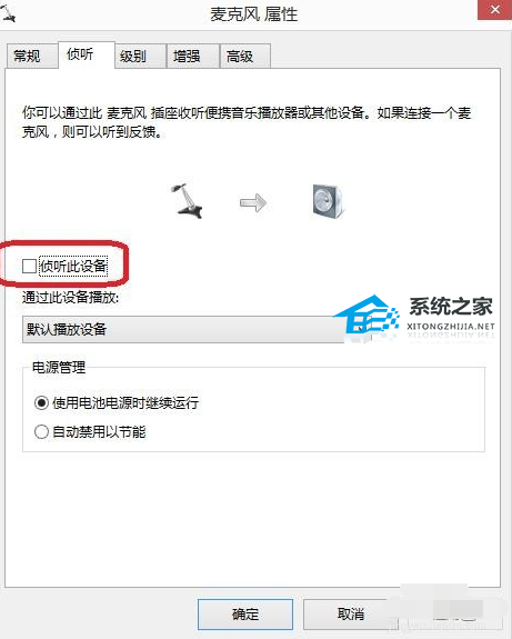 6、在麦克风属性--侦听中,找到侦听次设备,若打钩,请把钩去掉。