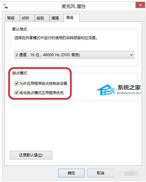 10、分别为“允许应用程序独占控制该设备”“给与独占模式应用程序优先”。