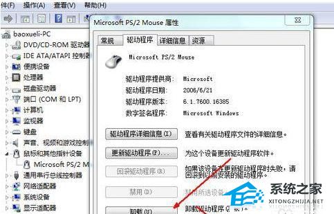 5、在鼠标属性页中,有关于驱动程序的详细信息,在最下面是一个卸载按钮,这就是卸载驱动的按钮,用鼠标点击这个卸载按钮,卸载当前的鼠标驱动。