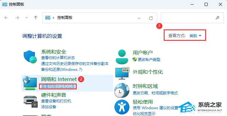 2、控制面板窗口,切换到【类别】查看方式,然后点击调整计算机的设置下的【查看网络状态和任务】;