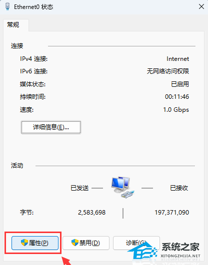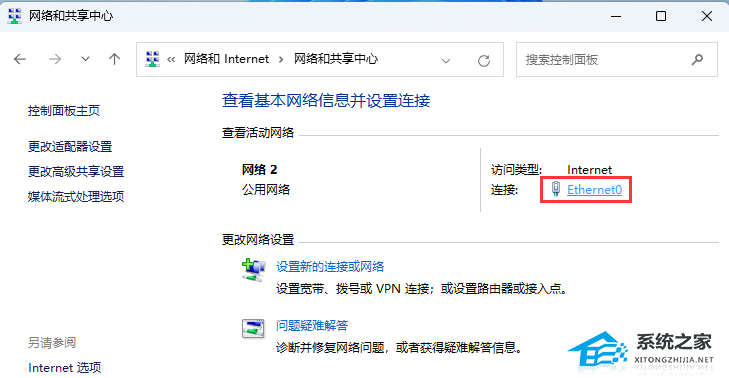 3、路径:控制面板 - 网络和 Internet - 网络和共享中心。点击连接的【网络】,打开【属性】;