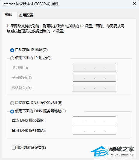 5、默认选择的是自动获得 DNS 服务器地址,然后点击【使用下面的 DNS 服务器地址】,填入【首选 DNS 服务器地址和备用 DNS 服务器地址】,点击【确定】即可。