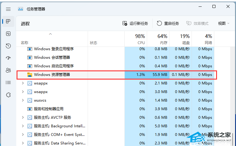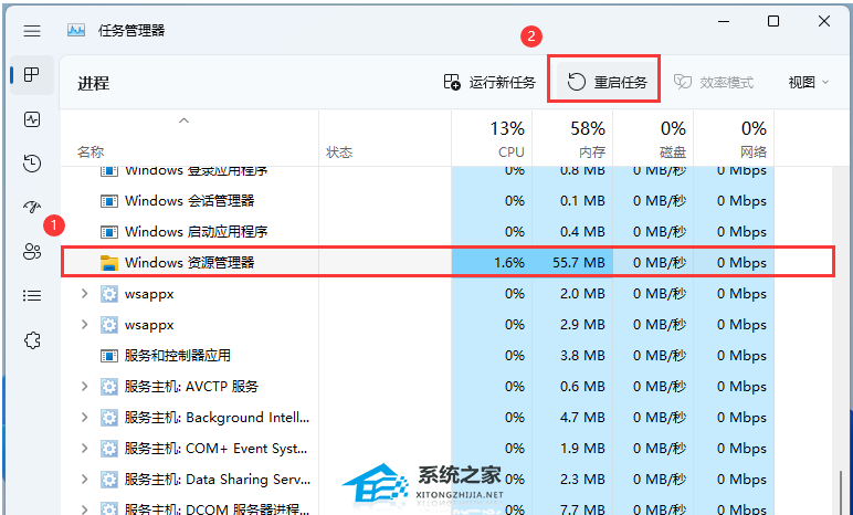 3. 选择【Windows 资源管理器】进程后,再点击右上方的【重启任务】,即可重启Windows 资源管理器,这其实是Windows 资源管理器进程explorer.exe结束后,又重新启动的过程。
