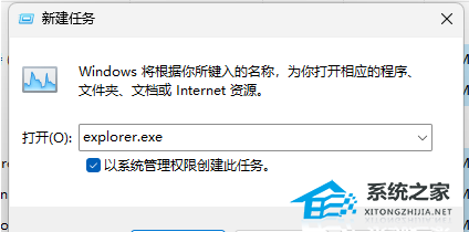 5. 新建任务窗口,输入【explorer.exe】命令,按【确定或回车】,即可重新启动Windows 资源管理器(建议勾选以系统管理权限创建此任务)。