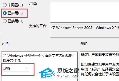 6、打开后勾选“已启用”,在下方选项中选择“忽略”,再点击“确定”保存后就能安装显卡驱动了。