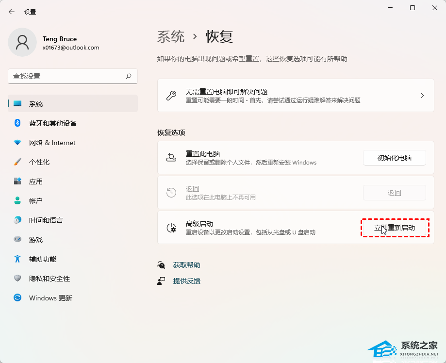 3. 恢复选项下,点击高级启动旁的【立即重新启动】。