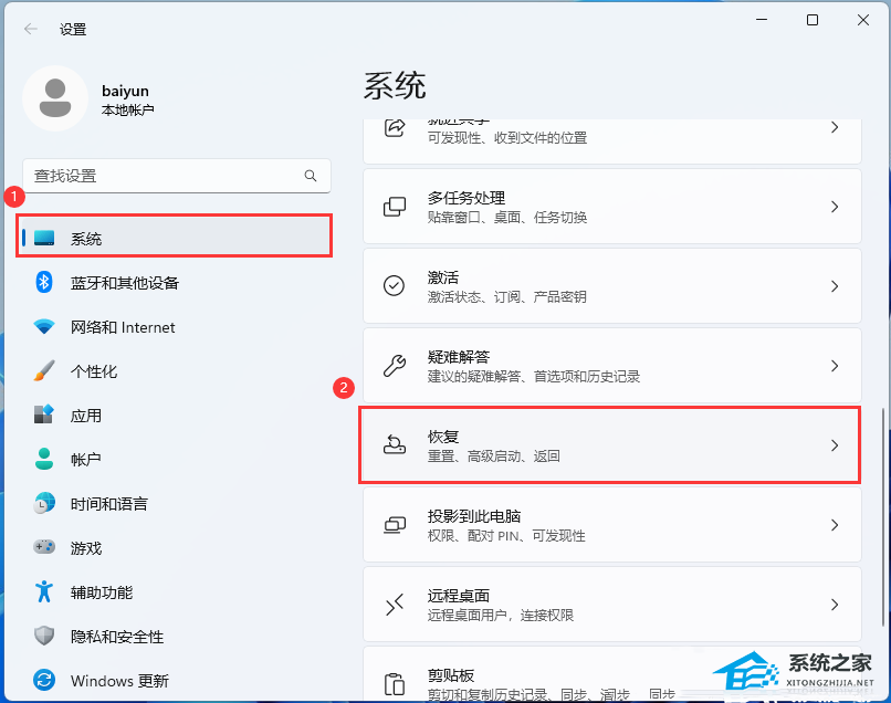2. 设置窗口,左侧选择到的是【系统】,右侧选择【恢复(重置、高级启动、返回)】。