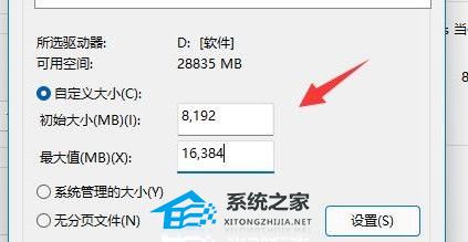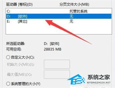 5、确保C盘没有设置虚拟内存,再点击选中其他分区,勾选自定义大小;