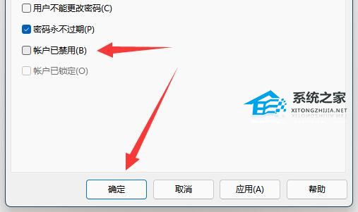 5. 进入后取消“账户已禁用”并确定,最后重启电脑就能正常登录那个账号了。