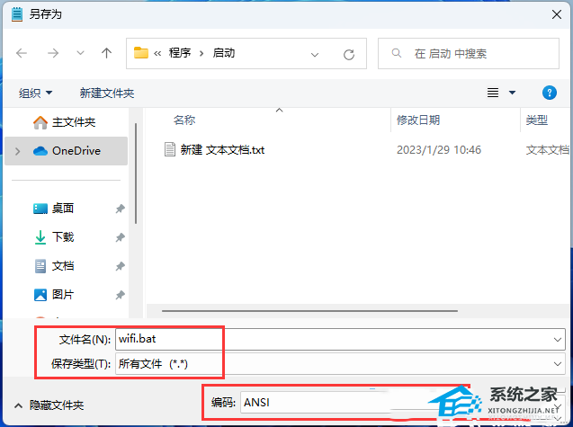 1)文件名填入以【.bat】结尾的名称,保存类型选择【所有文件】