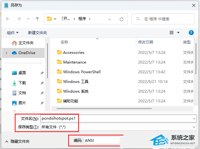 1)文件名填入以【.ps1】结尾的名称,保存类型选择【所有文件】