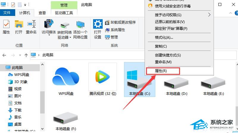 1、右键C盘选择“属性”选项,进入后右击本地磁盘(C:)选择“属性”选项。