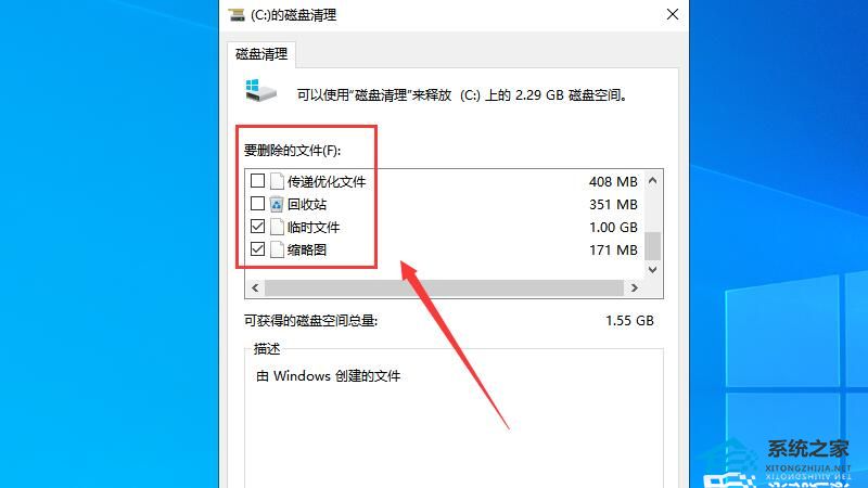 3、勾选需要删除的文件,如“临时文件”、“缩略图”等。