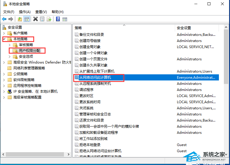 2. 按“WIN+R”打开运行,输入secpol.msc,打开本地安全策略,“本地策略、用户权限分配”下,“从网络访问此计算机”中添加本机guest用户,“拒绝从网络访问这台计算机”中将guest用户删除。