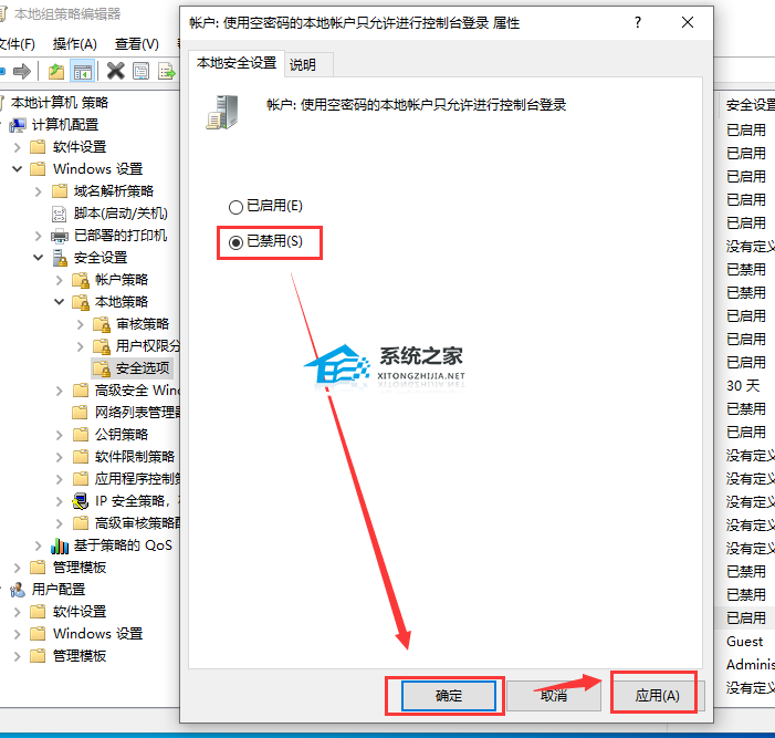 2. 在弹出的本地组策略编辑器窗口中,依次点击计算机配置-Windows设置-安全设置-本地策略-安全选项,接着在右边找到【账户:使用空密码的本地账户只允许进行控制台登录】,双击这个选项。