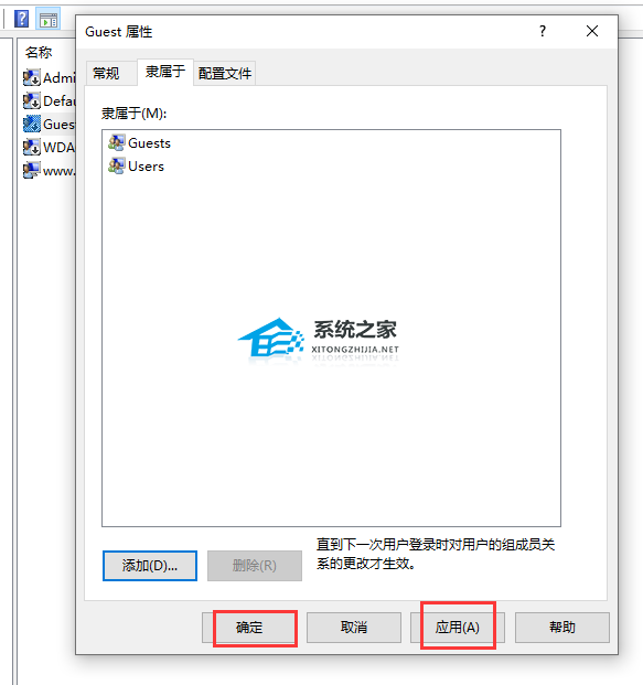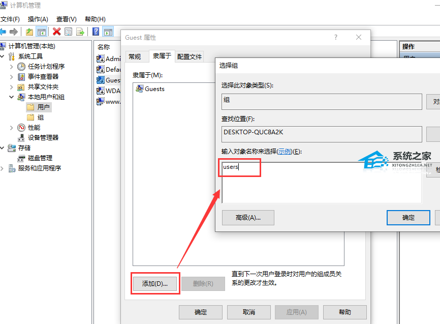 8. 接下来再回到Guest属性窗口,在隶属于选项中,选择users点击添加,然后点击下面的【确定】。