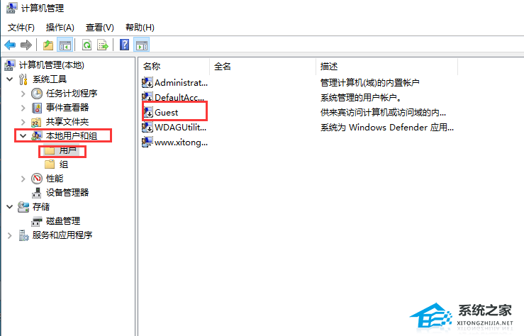 5. 打开计算机管理后,依次点击系统工具-本地用户和组-用户,然后找到右边的Guest,并双击打开。