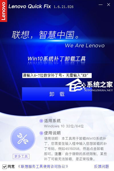 这款工具是联想官方出品的一款补丁卸载工具,适用于所有的电脑,用户只需要将更新补丁的kb后的数字输入点击卸载即可 。