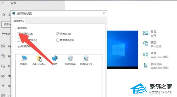 在桌面图标设置界面勾选上计算机后点击应用并确定即可。