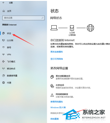 3、如图所示,切换到“状态”选项卡,点击“网络和共享中心”项进入。
