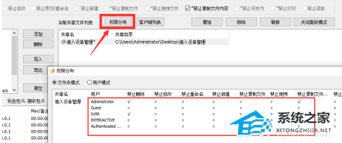 9、如果想查看某一共享文件的访问权限分配情况,可以在“共享文件”列表中选中相应的共享文件,点击“权限分布”按钮,此时就可以获取当前共享文件针对所有用户的访问权限的配置情况了。