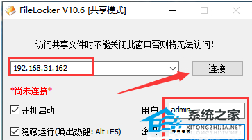 10、针对共享文件的访问方法:如果局域网电脑想对共享文件进行访问操作,则电脑上需要安装相应的客户端程序,并保持后台运行状态即可。首先,输入局域网文件服务电脑的IP地址,接着再输入用户信息,点击“连接”按钮后将自动完成身份验证操作,并开始按特定访问权限对共享文件进行访问操作。