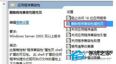 3、选中应用程序兼容性文件夹,在右边窗口找到并双击删除程序兼容性属性页策略进入。