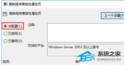 4、在弹出的删除程序兼容性属性页对话框,勾选未配置选项点击确定按钮即可。