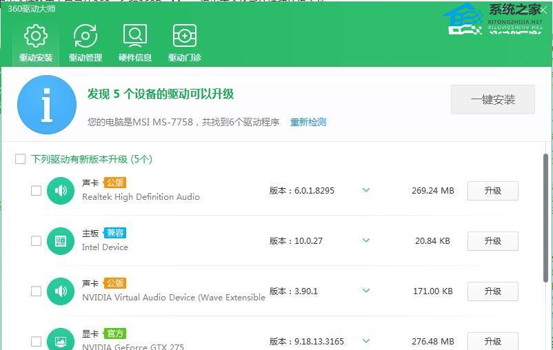安装360驱动大师,安装完成后运行它,进行硬件检测,检测完成后将显卡驱动进行更新。
