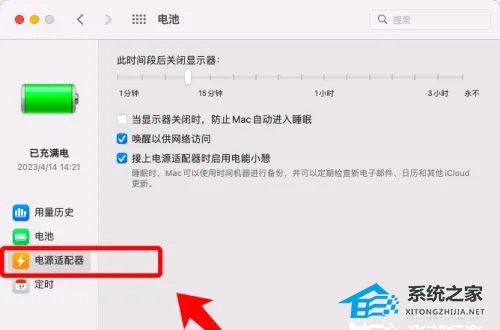 2. 点击“电池”选项,点击左侧边栏的“电源适配器”。