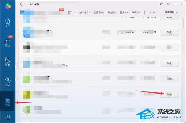 3、点击页面左边,找到“卸载”,然后在右边找到CAD软件,找到右边的“卸载”。