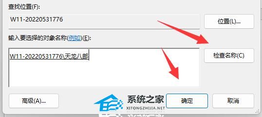 6. 点开后,输入我们的账户名称,再“检查名称”并确定。
