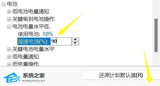 6、最后在其中修改“电池电量水平低”下的“接通电源”数值到“90”即可。