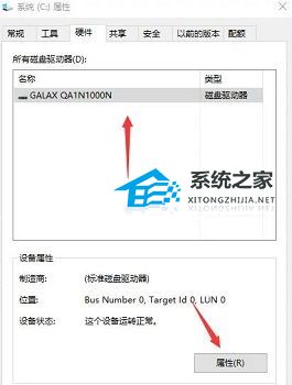 3、然后选择我们自己的硬盘,点一下右下方“属性”。