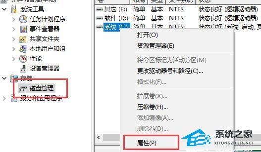 2、之后在硬盘管理中寻找“C盘”,右键选中它,进到“属性”。