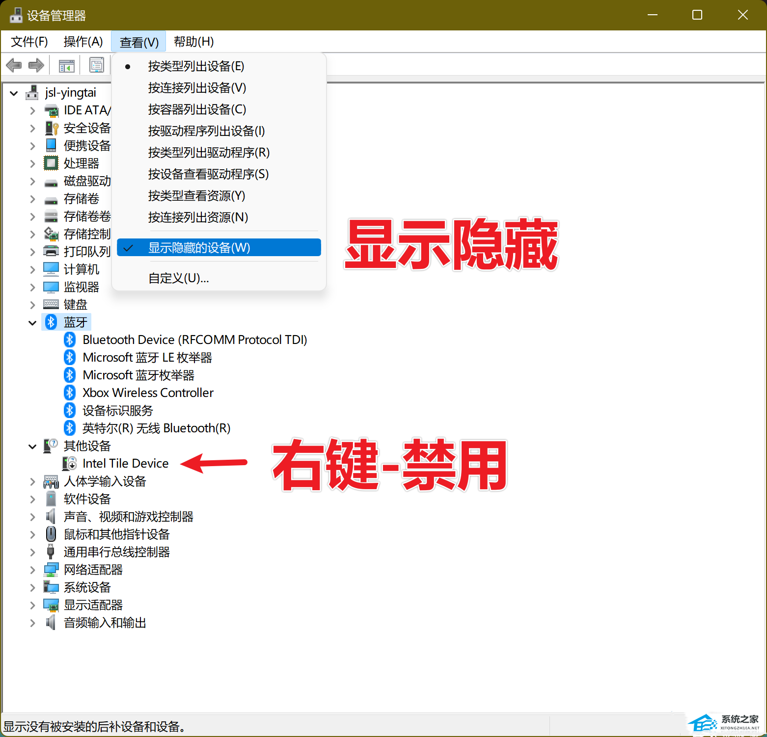 1、打开设备管理器——查看——显示隐藏设备——其他设备——禁用 Intel Tile Device。