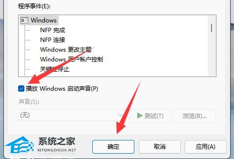 5、最后将左下角的“播放Windows启动声音”取消勾选,点击确定保存就可以了。