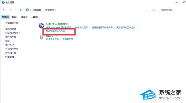 第三步:轻松使用中,找到“更改键盘的工作方式”,如下图所示: