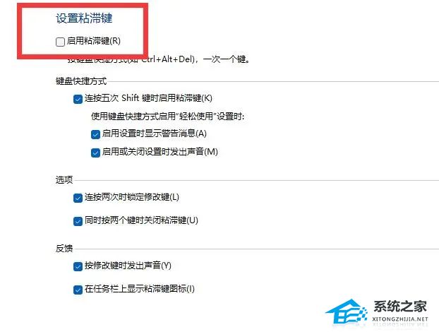 第四步:进入后找到“设置粘滞键”,进入后取消“启动粘滞键”,也就是不勾选。