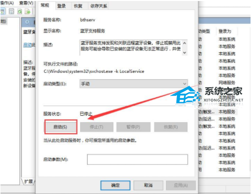 4、双击打开【蓝牙支持服务】,服务状态为已停止,点击【启动】就行了。