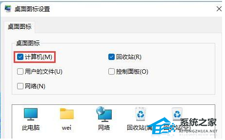5、在其中桌面图标下方勾选“计算机”开启。