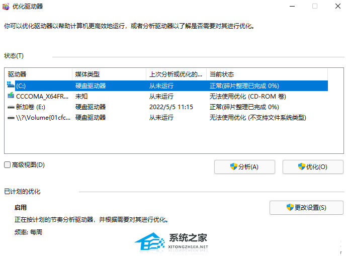 4、最后我们可以点击“分析”按钮来了解一下其是否需要被优化,最后选中需要进行碎片整理的驱动器,点击下方的“优化”按钮即可。