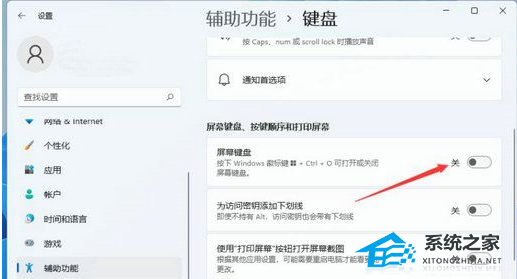 第四步:我们鼠标点击屏幕键盘右侧的开关就能开启屏幕键盘了。