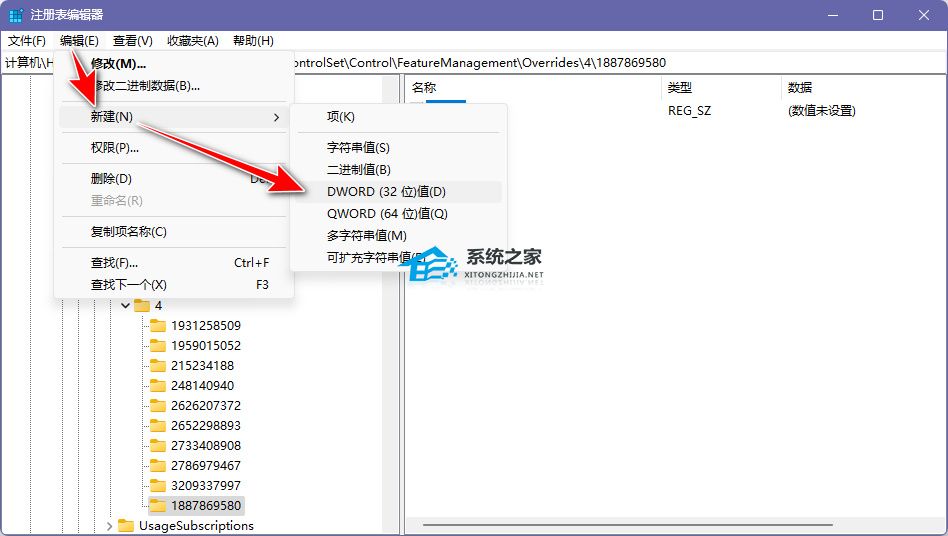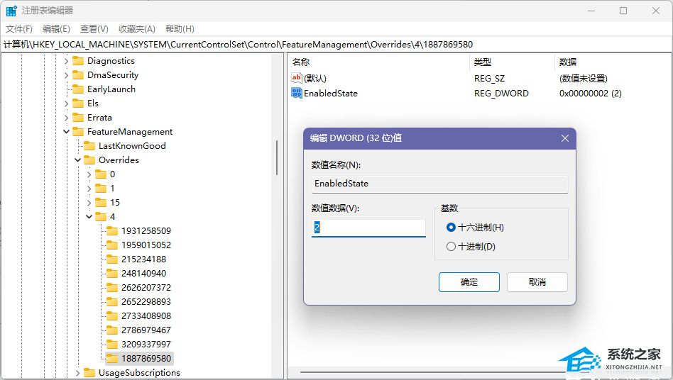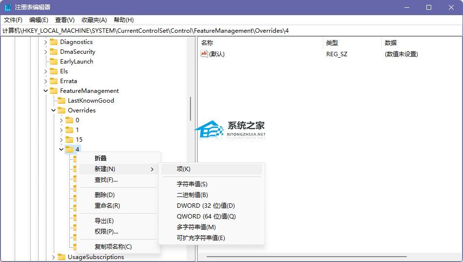 3、在注册表编辑器的顶部地址栏访问:计算机HKEY_LOCAL_MACHINESYSTEMCurrentControlSetControlFeatureManagementOverrides4